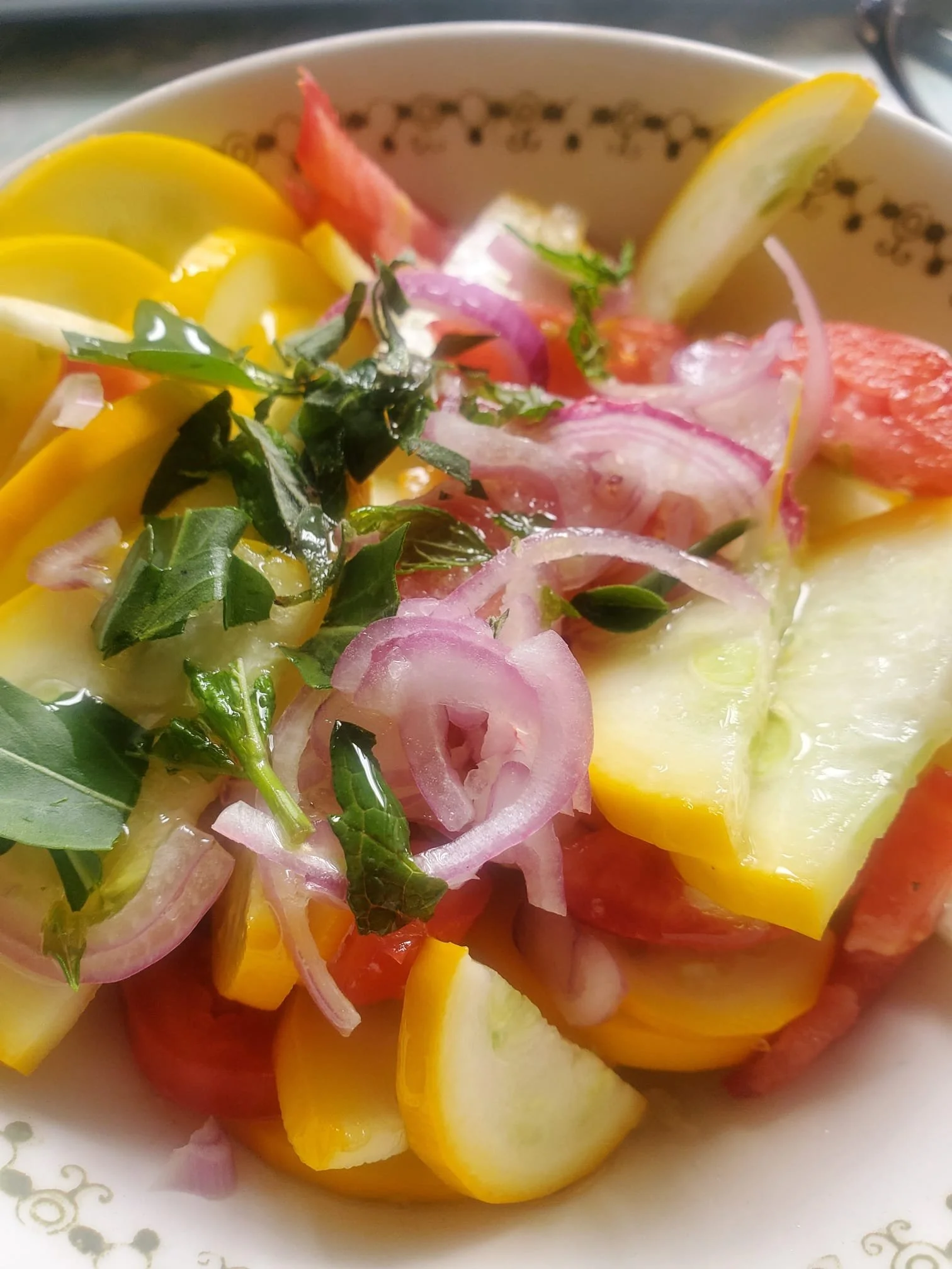Today I ate a small, very delicious salad from my garden. One yellow zucchini, a couple of different tomatoes, a purple onion and some radish seed pods (please start eating those! They’re ridiculously good) mint, rocket and oregano. Lemon, salt and olive oil . That’s it.